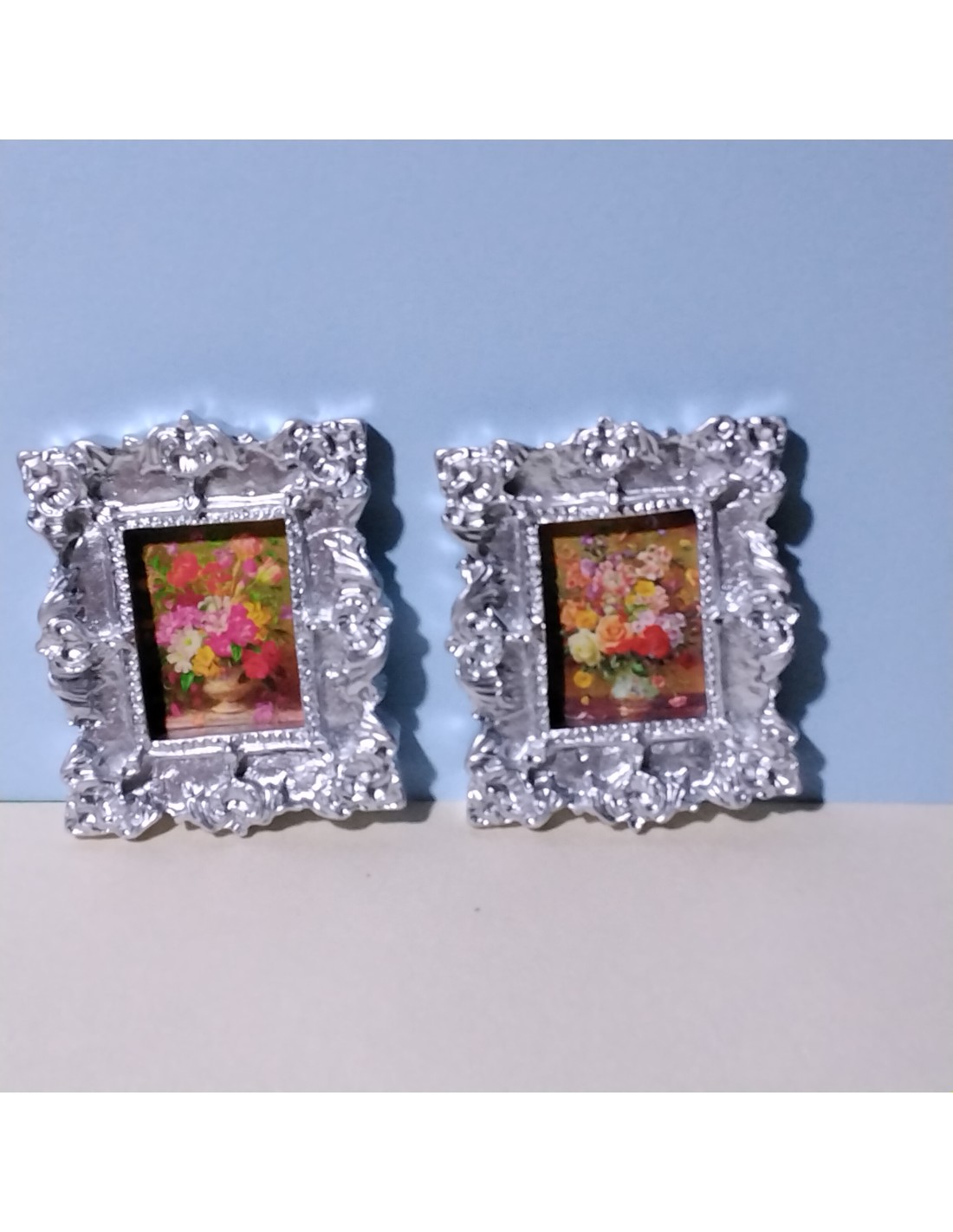 Cuadro de jarrón con flores, marco plateado y repujado, material resina.