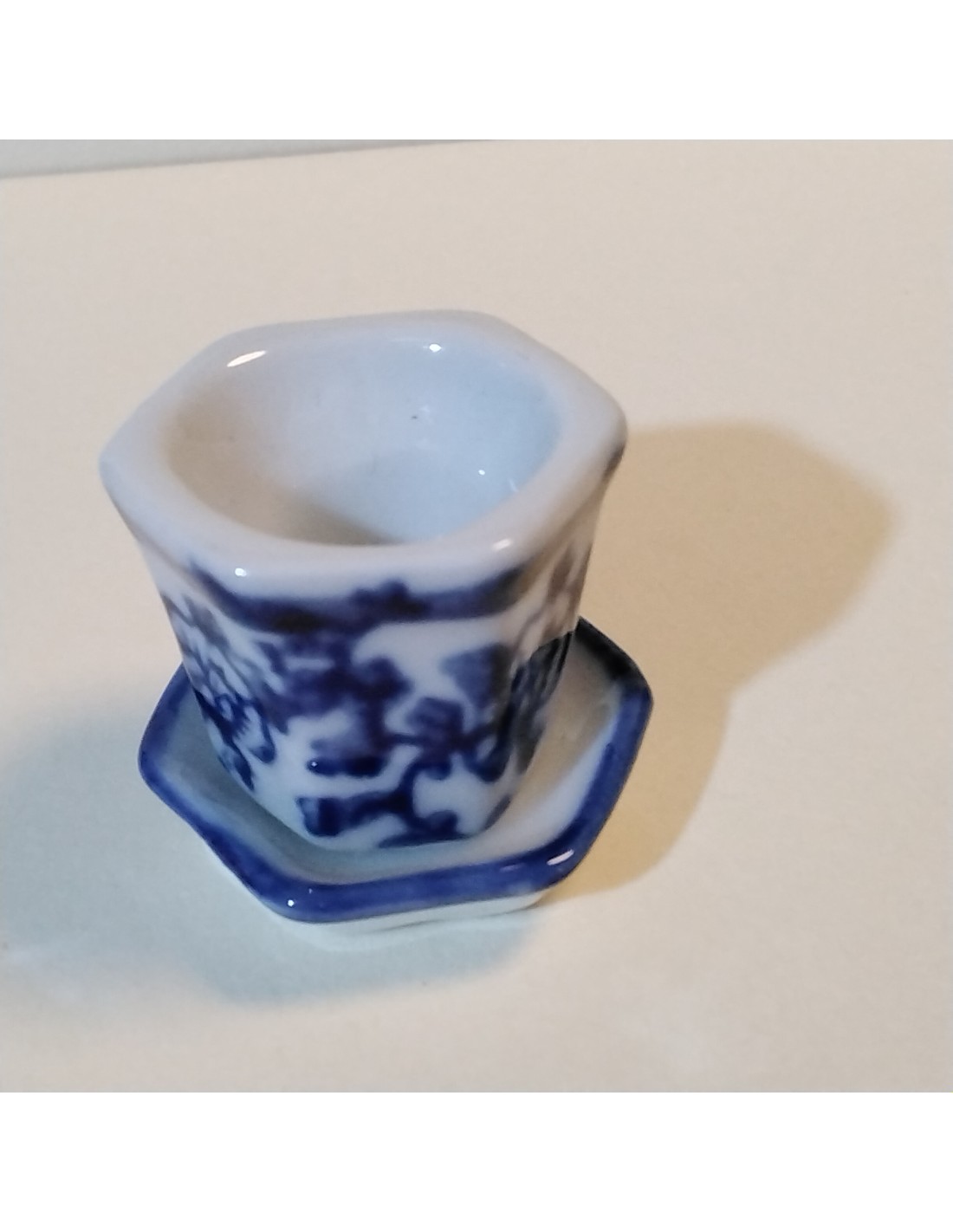 Macetero y plato de porcelana y decorado en azul.